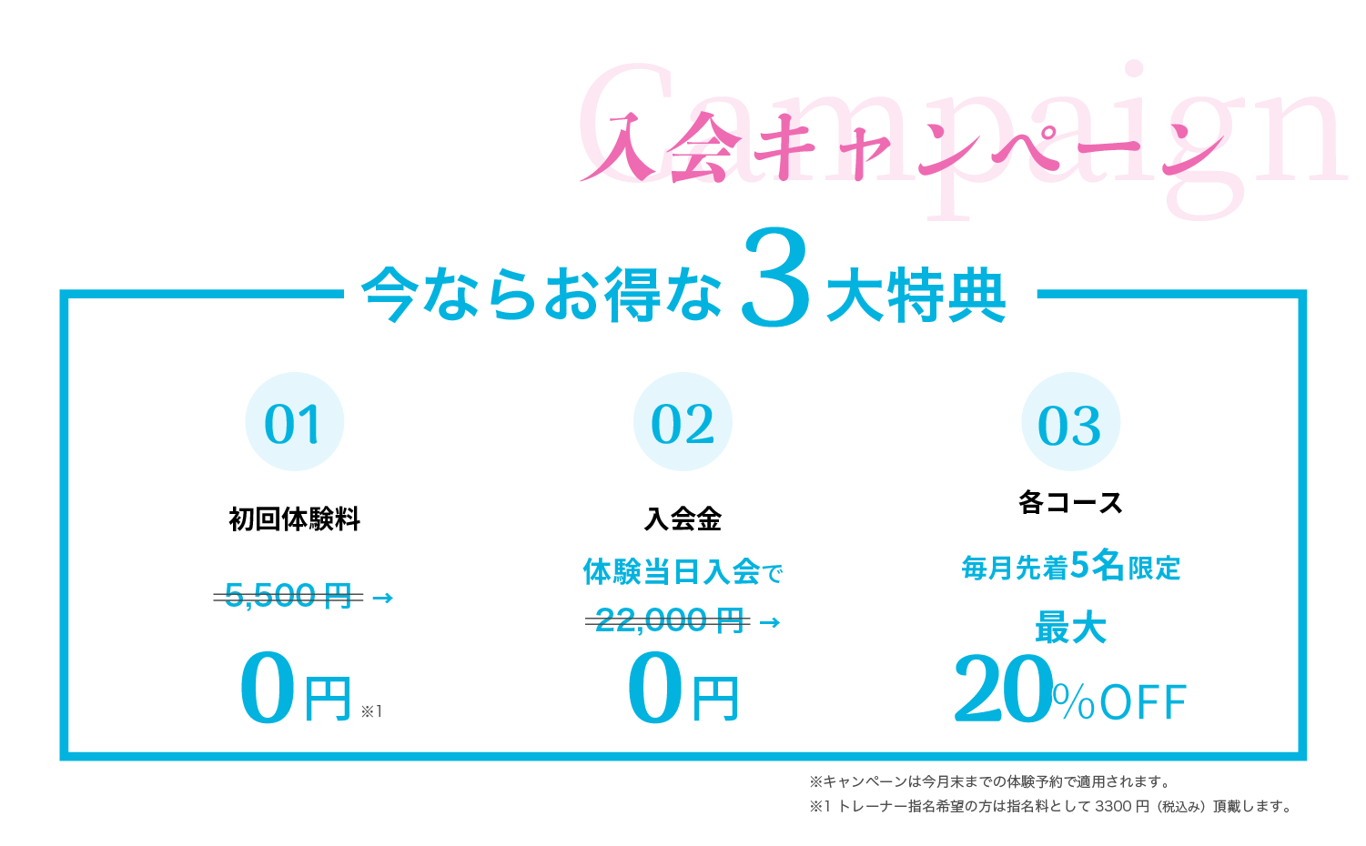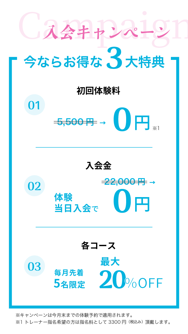 無料カウンセリング、体験トレーニング後、ご入会ご希望のお客様はそのまま申し込みいただけます。当日にご入会いただくと、入会金¥22,000が無料でのご案内となります。